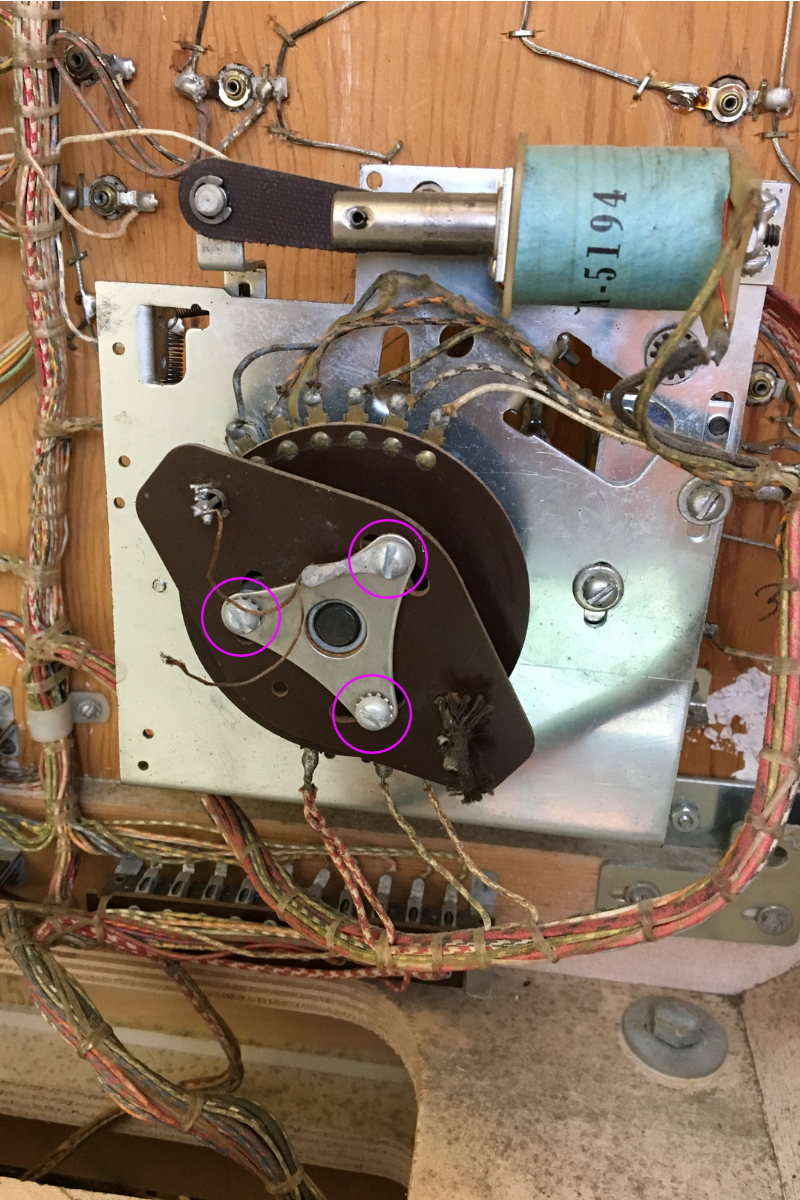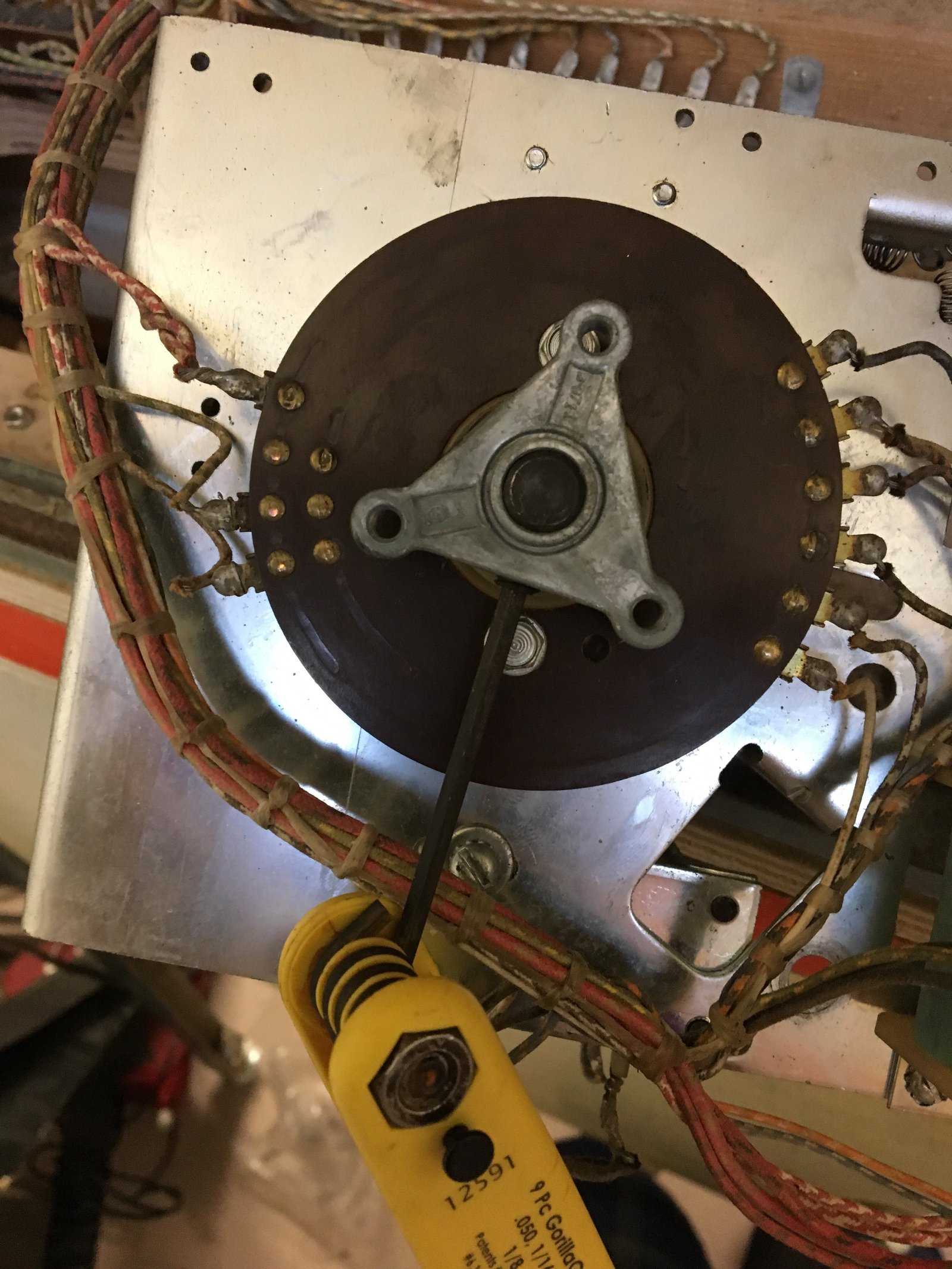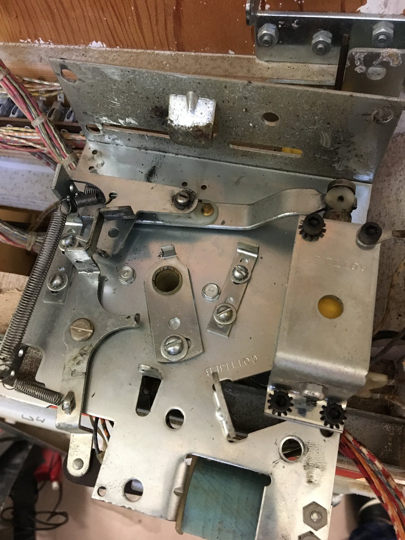 I like to do a few checks when inspecting a game of unknown state. I check the fuses along with the fuse holder. I found one 2A slow-blow fuse that was blown. I replaced it with a circuit breaker. This fuse is connected to the 10-bank drop target reset. I then go through ever coil and move it and see if any are stuck. I went through the whole game and didn’t find any. The last check I do is move all the steppers (including score reels) and see if they are moving freely. All steppers moved freely except the ball stepper and the bonus unit. I went ahead and took apart the ball stepper and cleaned and re-lubed the assembly along with checking and cleaning the contacts switches.