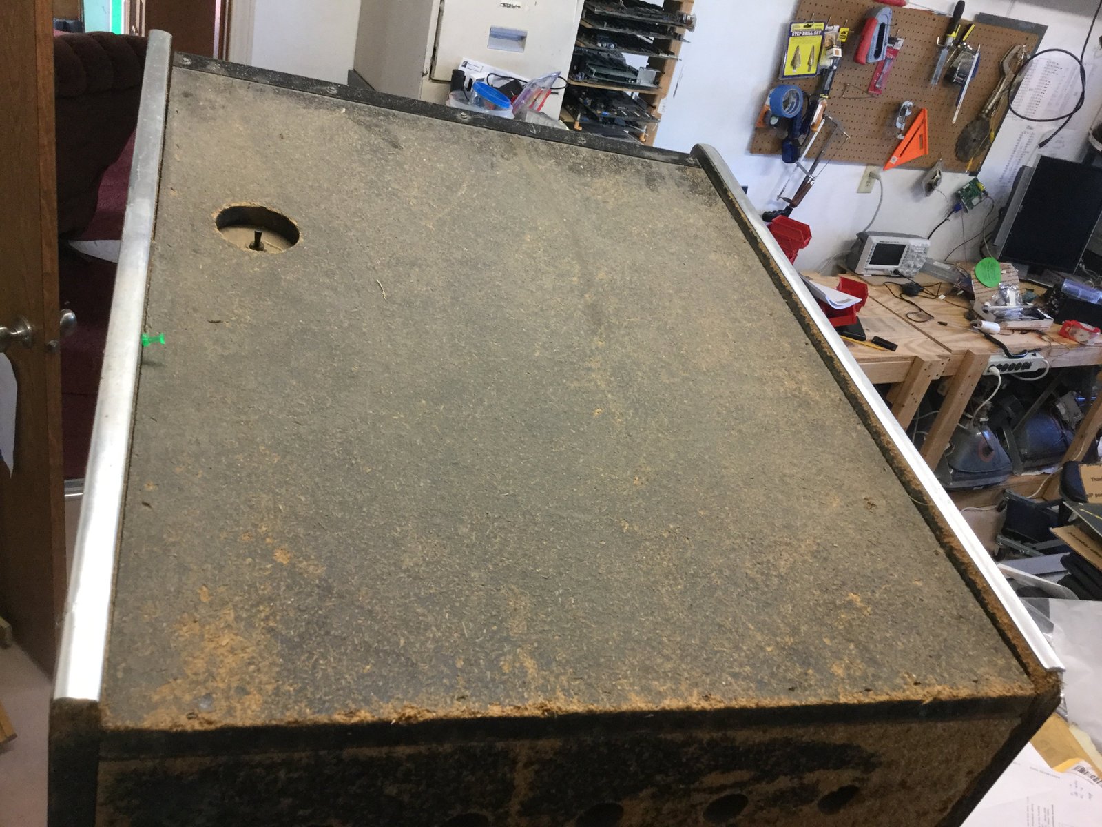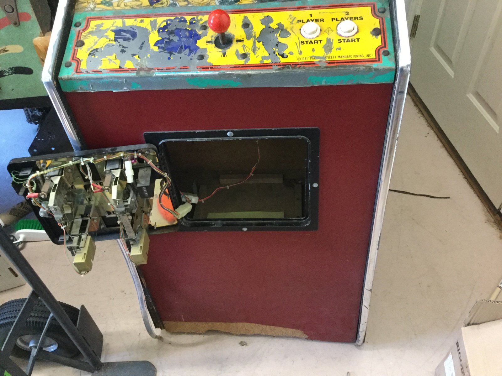 I recently purchased a Pacific Thief arcade game that was in pretty rough shape. I took it to my father-in-law, and it was returned back to me today. He has the knowledge and tools for the woodwork. I need to bondo and paint the cabinet, but what an improvement! I also had the new CPO come in, but need to get some primer and paint before I apply it.