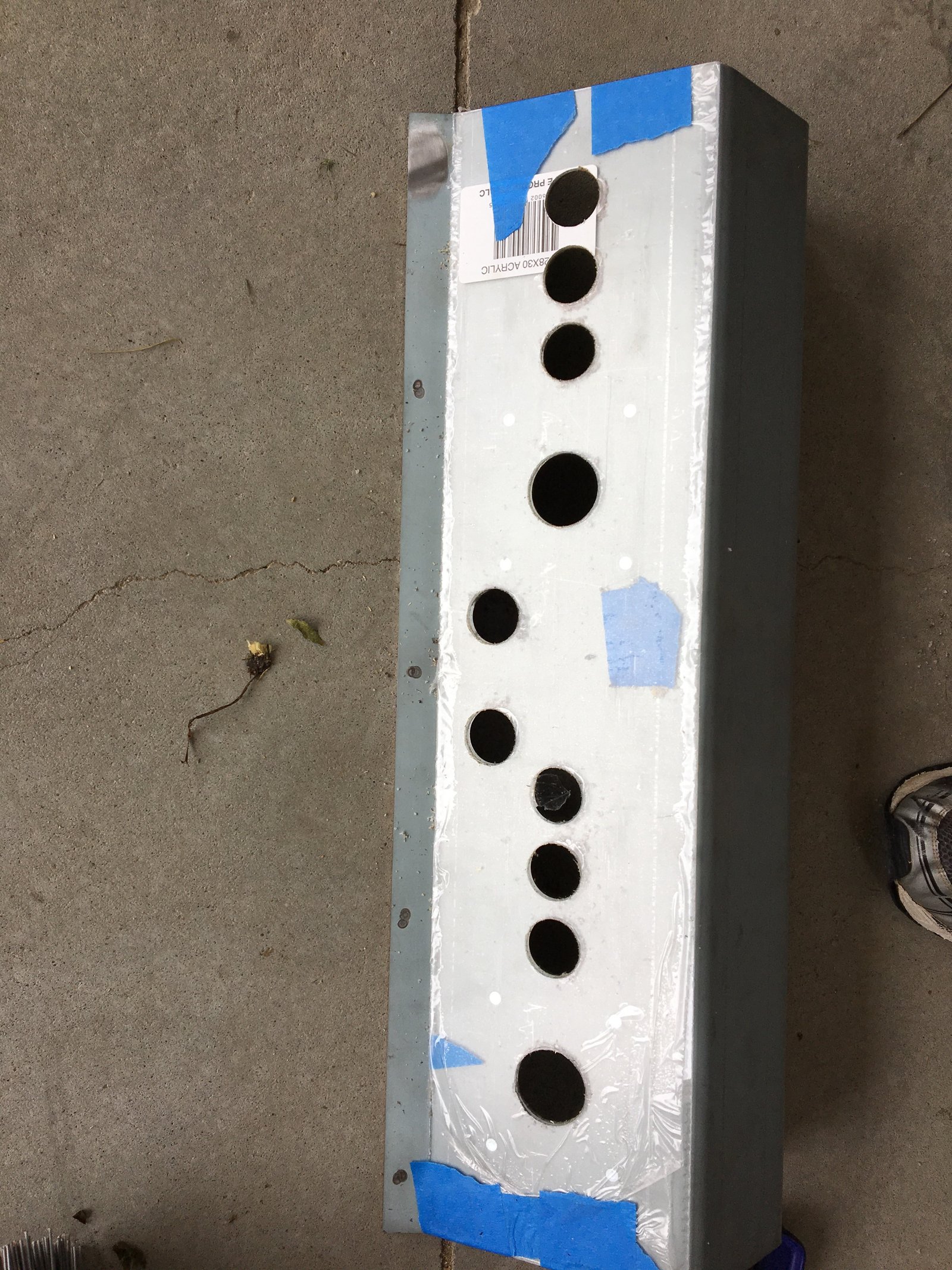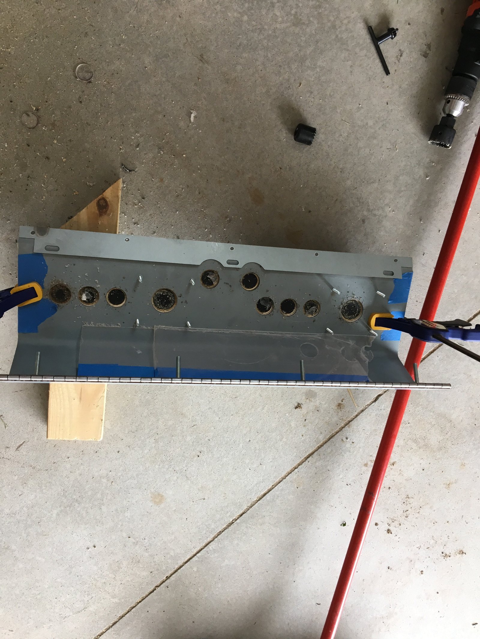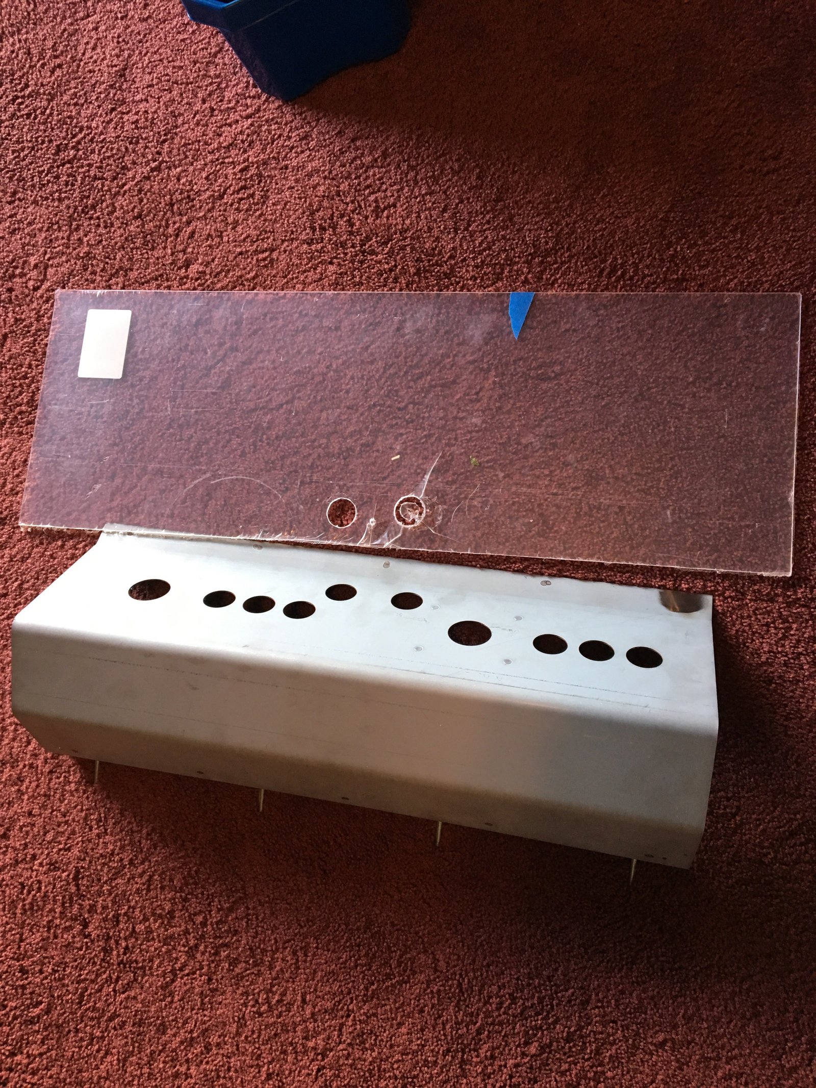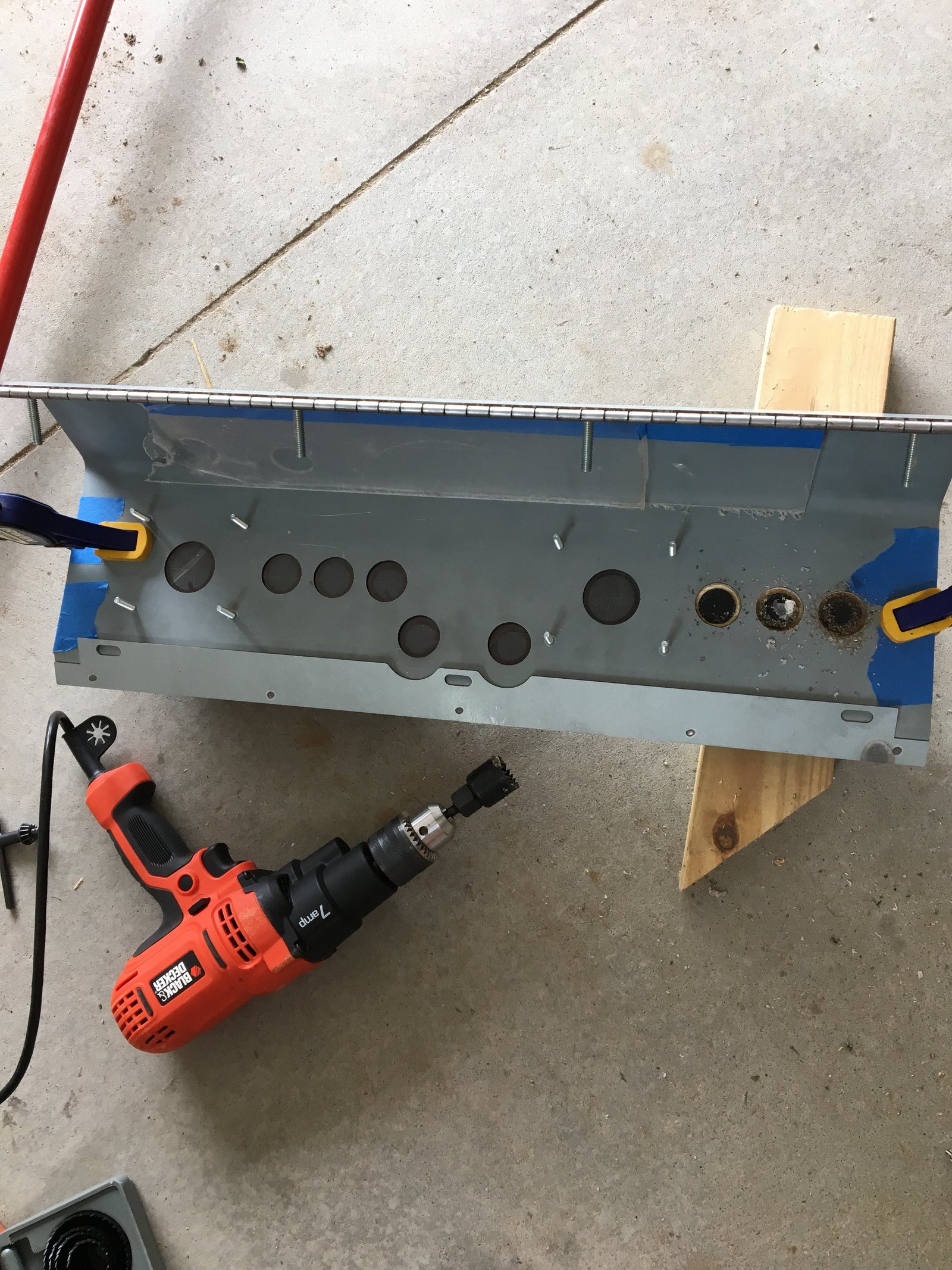 I also had an extra piece of plexiglass and decided to add that to the control panel. I lined up the plexiglass to the control panel and tapped the edges. I then sandwiched the plexiglass between the control panel and a block of wood. I took a hole saw and drilled out all of the holes for the buttons and joysticks.