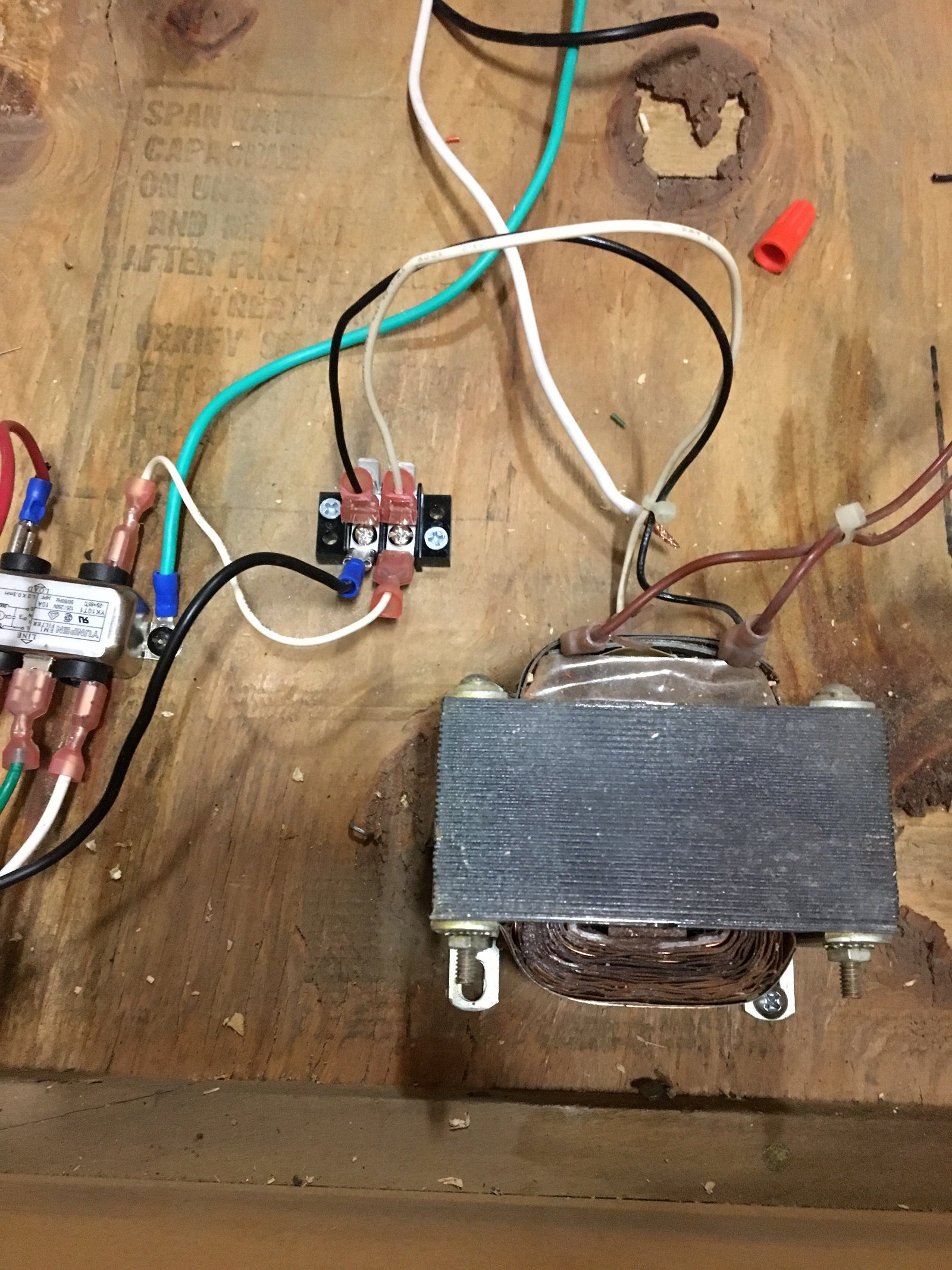 Here’s are some photos of how I wired up my Dynamo cabinet. I ran both HOT and NEUTRAL to a distribution block. You can use wire nuts just as easily, but I prefer the look of the distribution blocks. I took pictures of both methods. The ground also needs to be connected together. This can be done off of the AC filter, or again, a distribution block.