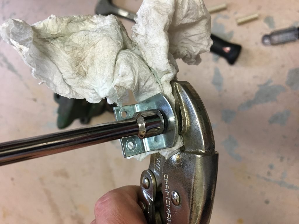 The roll pin I reused and installed with the new link/plunger. I put the pawl on my work vise and hammered out the roll pin. A nail set (or even a small nail) can punch out the roll pin out of the pawl/plunger. Hammer the roll pin into place. (A Vise Grip helps to get the roll pin in position.