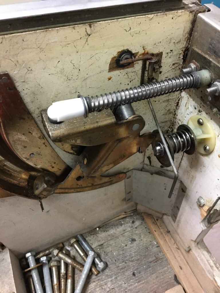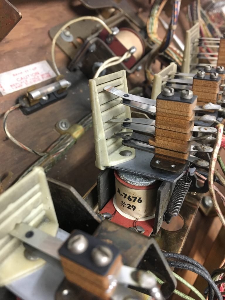 The next step was moving to the control bank setup. Releasing the wing nuts on the unit gave access to the switches. I cleaned and checked all the switch including the SB Armature switch. When I finished with the control bank, I cleaned and put in a new coil sleeve on the coil that resets the bank. It was pretty greasy. The power cord was replaced and I again applied power.