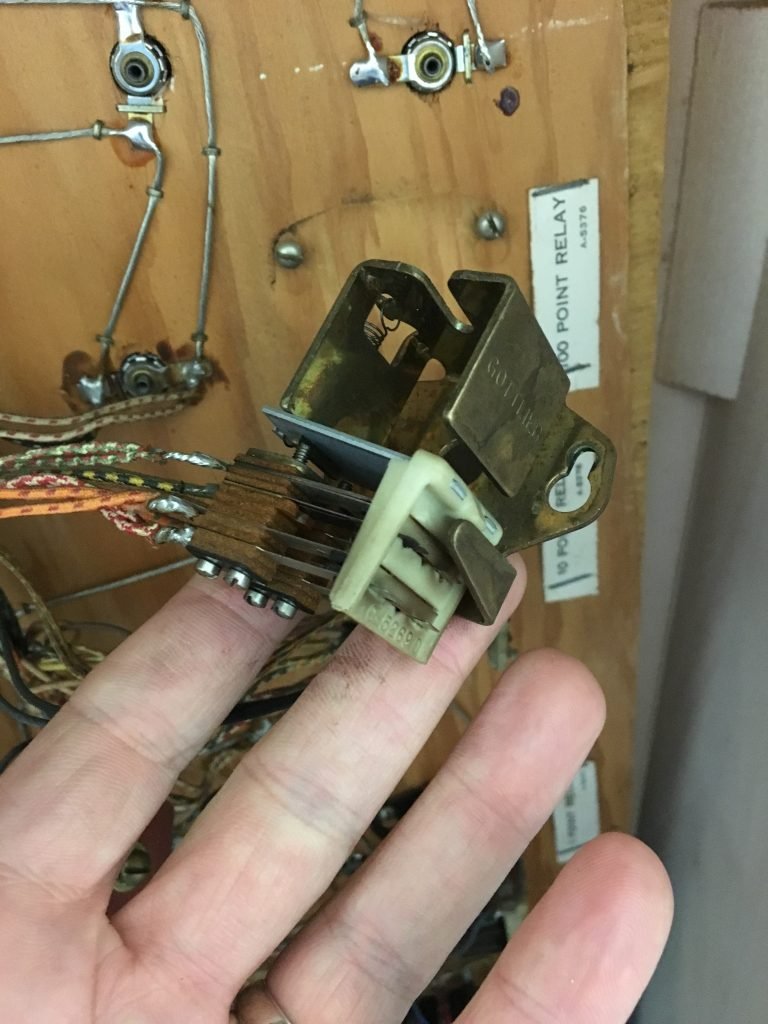 At this point, I decided to take the motherboard out of the game and work on it at a more comfortable level. The score motor was not moving, and I looked for any type of binding or something that was blocking it from moving. There was nothing binding the motor, so I added quite a bit force to finally free the motor. The motor had so much grease which had hardened in place. At this point I cleaned the motor along with all of the switches. All was good, so it was time to move on to the relays.