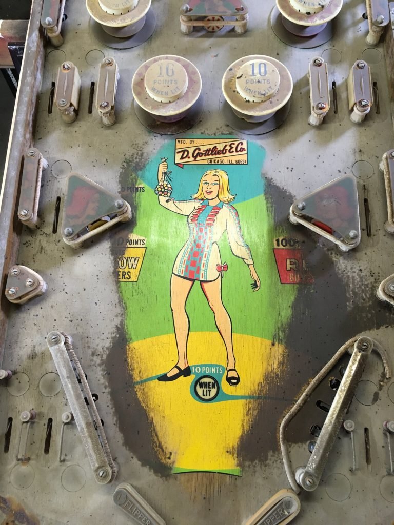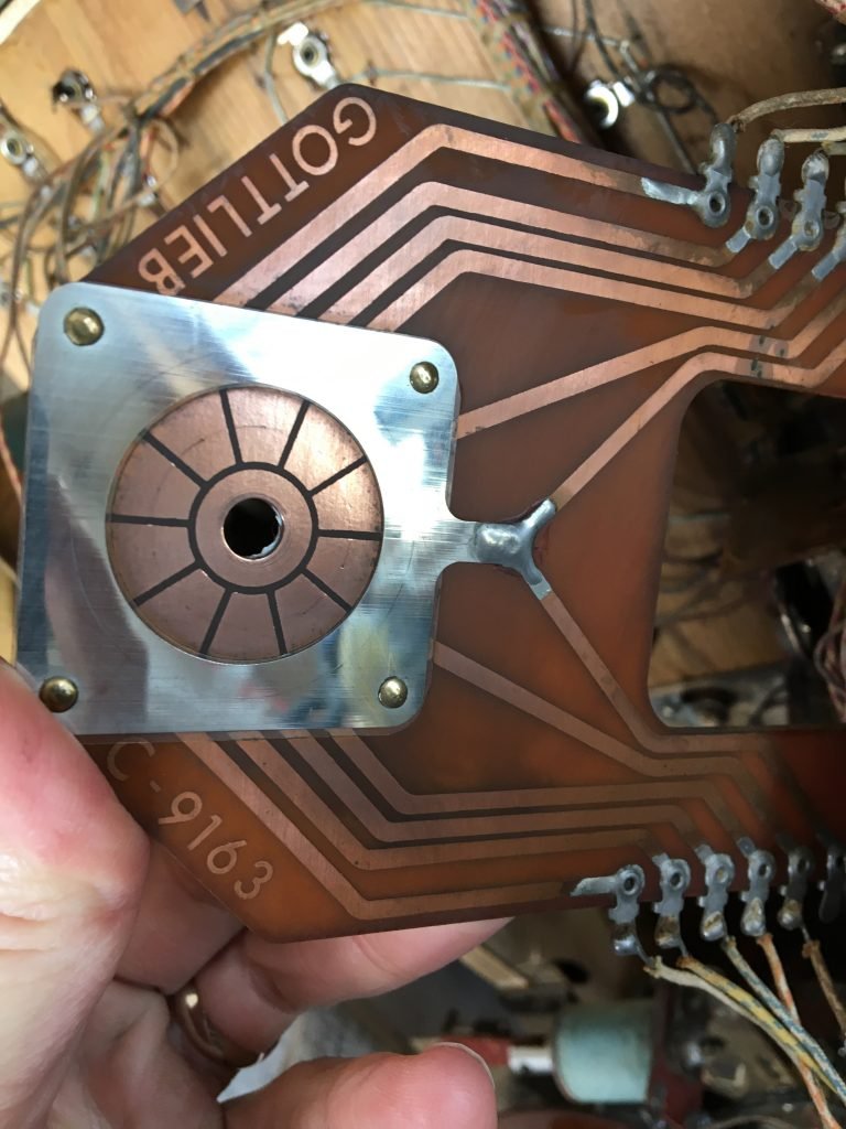 He did a great job cleaning it, redoing the backglass, and cabinet. Once he got it back to a reasonable state, he called me to see if I would go over the electronics of the game. He did quite a bit of cleaning on all the mechs and switches, so this significantly helped. I have worked on a number of Gottliebs now and finding them to be a love/hate relationship. Sky Jump, Strange World, King and Queens, and El Dorado are a few I have done in the past.