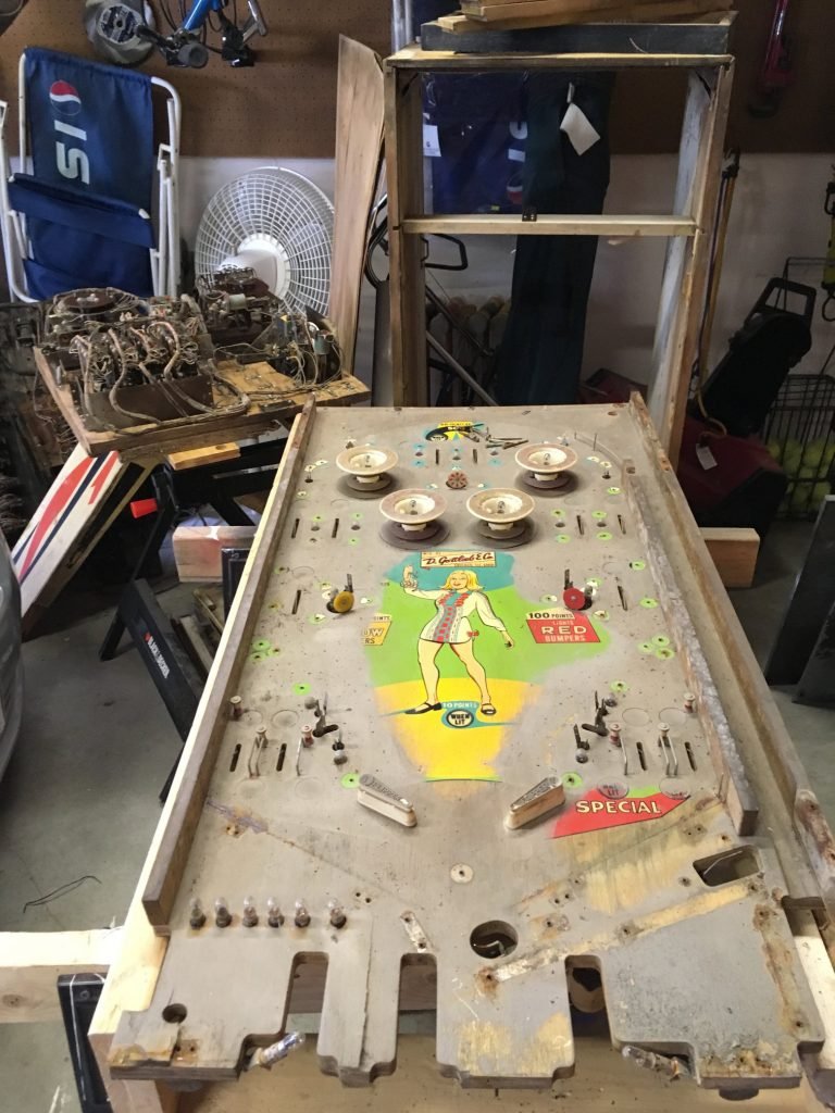 One of my favorite customers bought this game as a project to see if he could restore it. This game did not weather well (pun intended) as it was in a house that had flooded last spring.